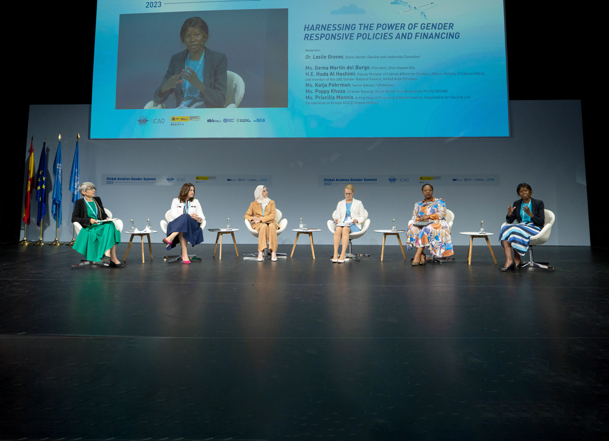 In addition to Huda Al Hashimi, the session was attended by: Poppy Khoza, Director General, South African Civil Aviation Authority; Priscilla Mannis, Acting Head, Administration and Finance, OSCE Mission to Kosovo; Gema Martin del Burgo, President of the Ellas Vuelan Alto, which works to highlight female talent in the aviation sector; Katja Pehrman, Senior Adviser, UN Women, and Dr. Leslie Groves Williams, Senior Gender Equality and Leadership Consultant who moderated the panel discussion.